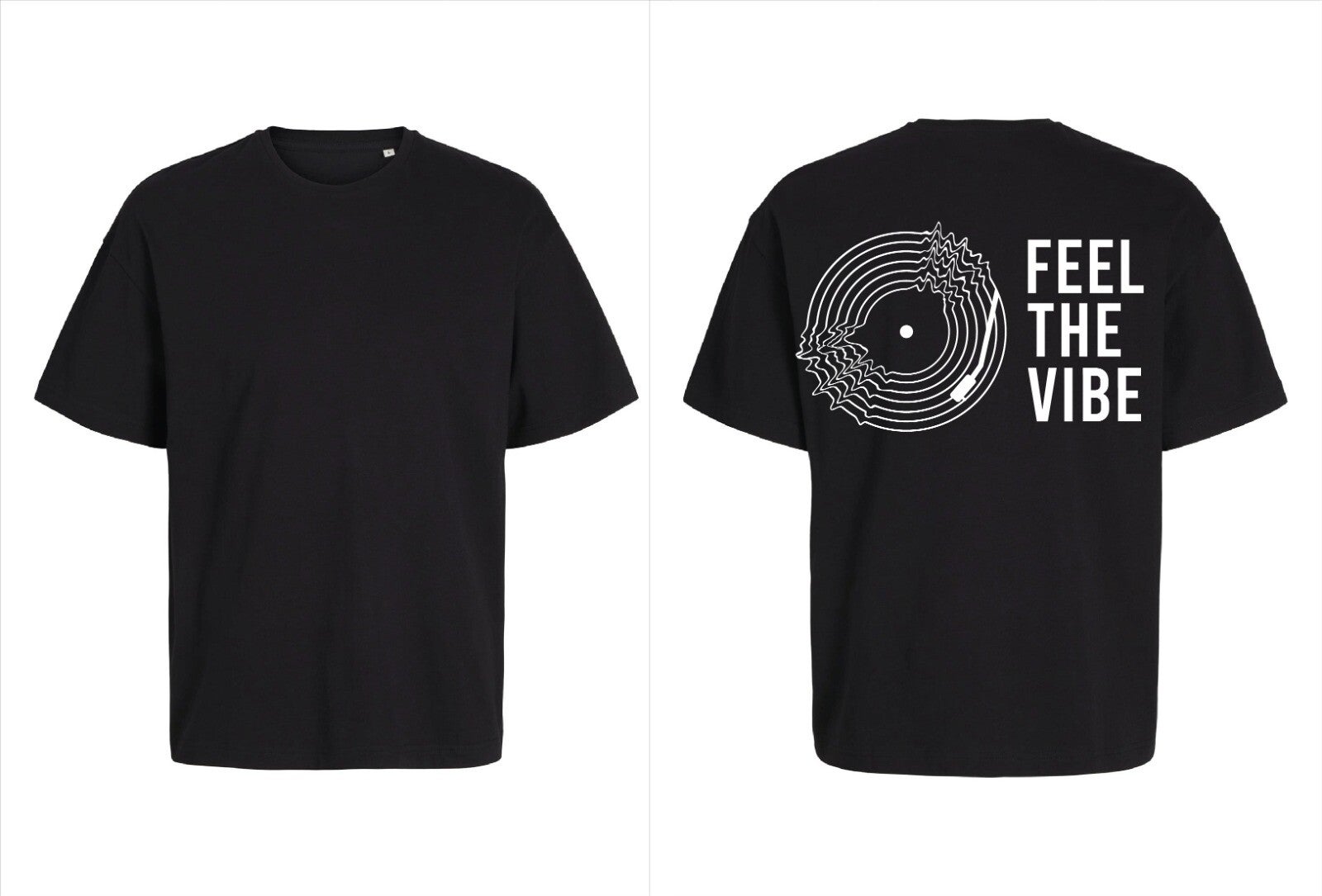 Op de voorkant houdt hij het strak en minimalistisch – full black, zodat hij overal bij past. Op de achterkant knalt de print eruit: een stylized vinyl/vibes-logo met daarnaast de tekst FEEL THE VIBE. Subtiel genoeg voor elke dag, opvallend genoeg voor elke dansvloer.