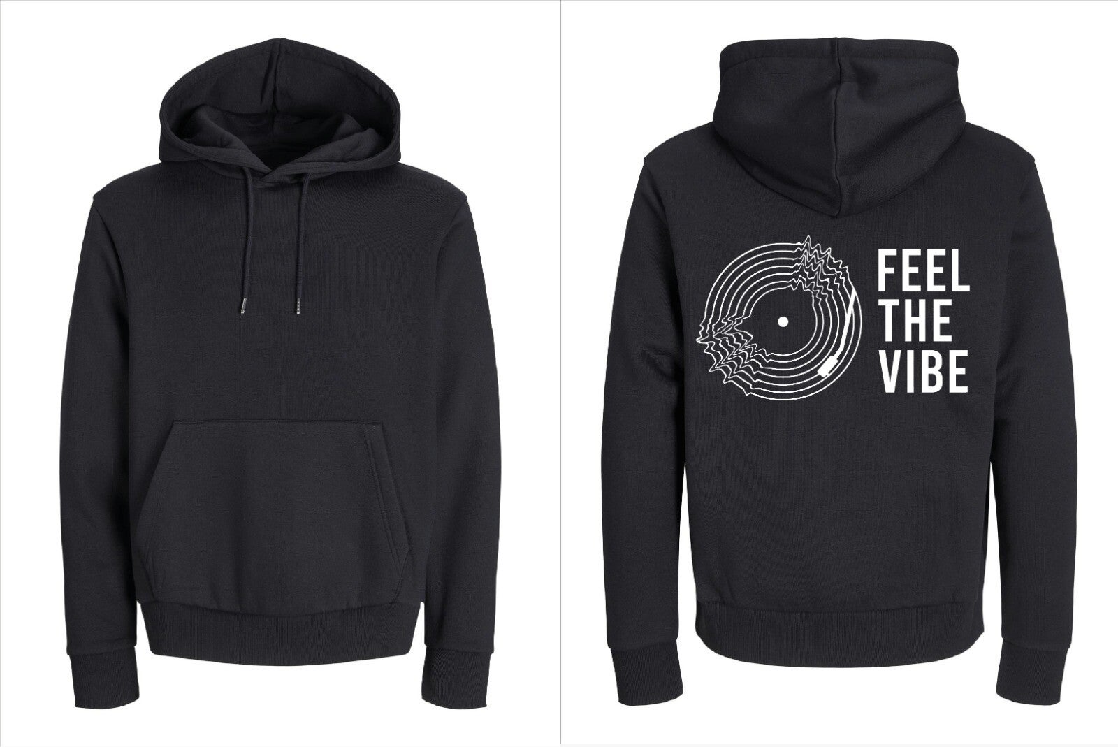 Op de voorkant houdt hij het strak en minimalistisch – full black, zodat hij overal bij past. Op de achterkant knalt de print eruit: een stylized vinyl/vibes-logo met daarnaast de tekst FEEL THE VIBE. Subtiel genoeg voor elke dag, opvallend genoeg voor elke dansvloer.