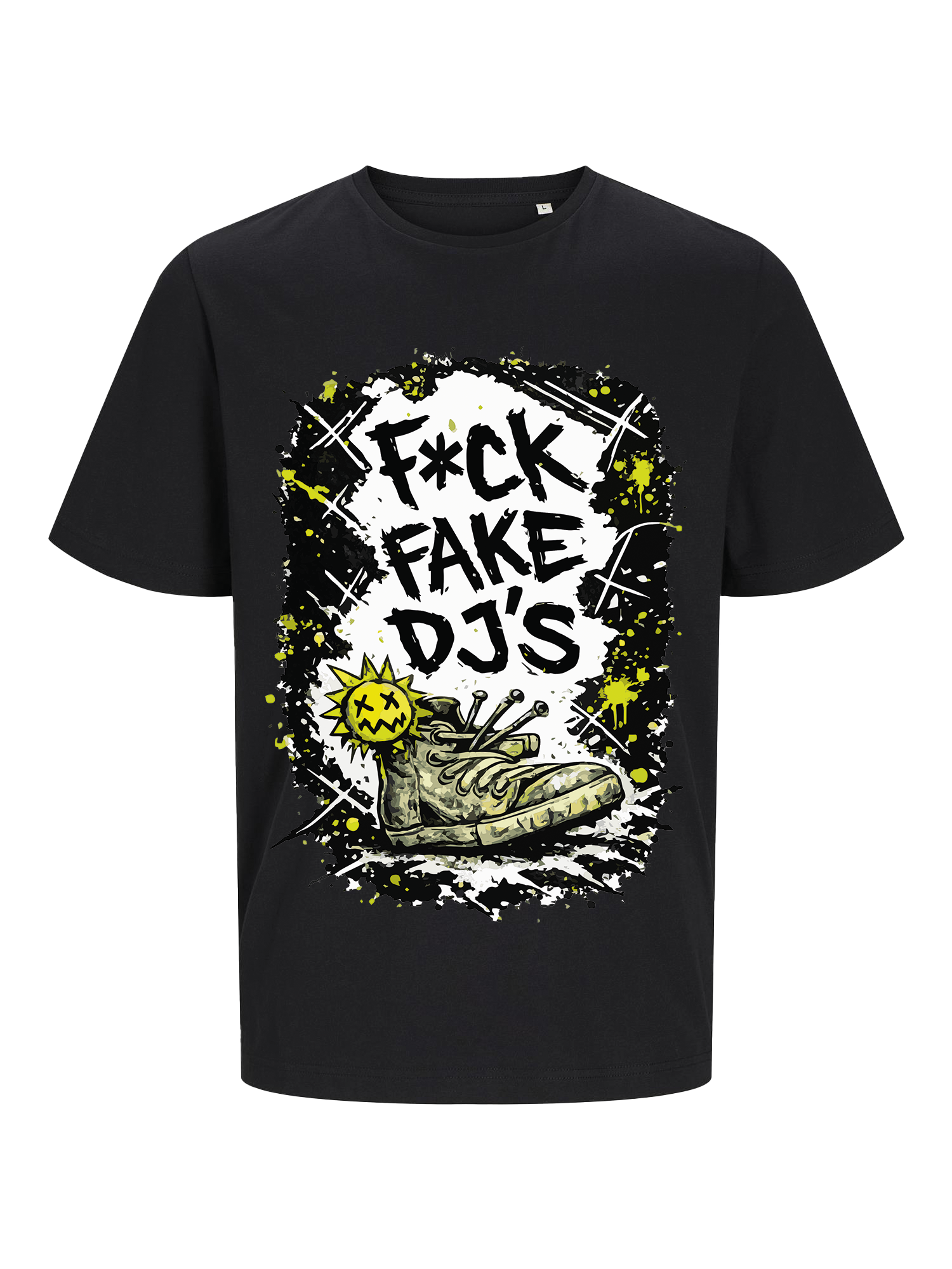 The F*ck Fake DJ's Black T-shirt from Merchandise Sunny D is a striking statement shirt for anyone who loves real music and authentic DJ culture. The large graphic print on the front combines a rugged graffiti style with a striking sneaker design and neon yellow accents.