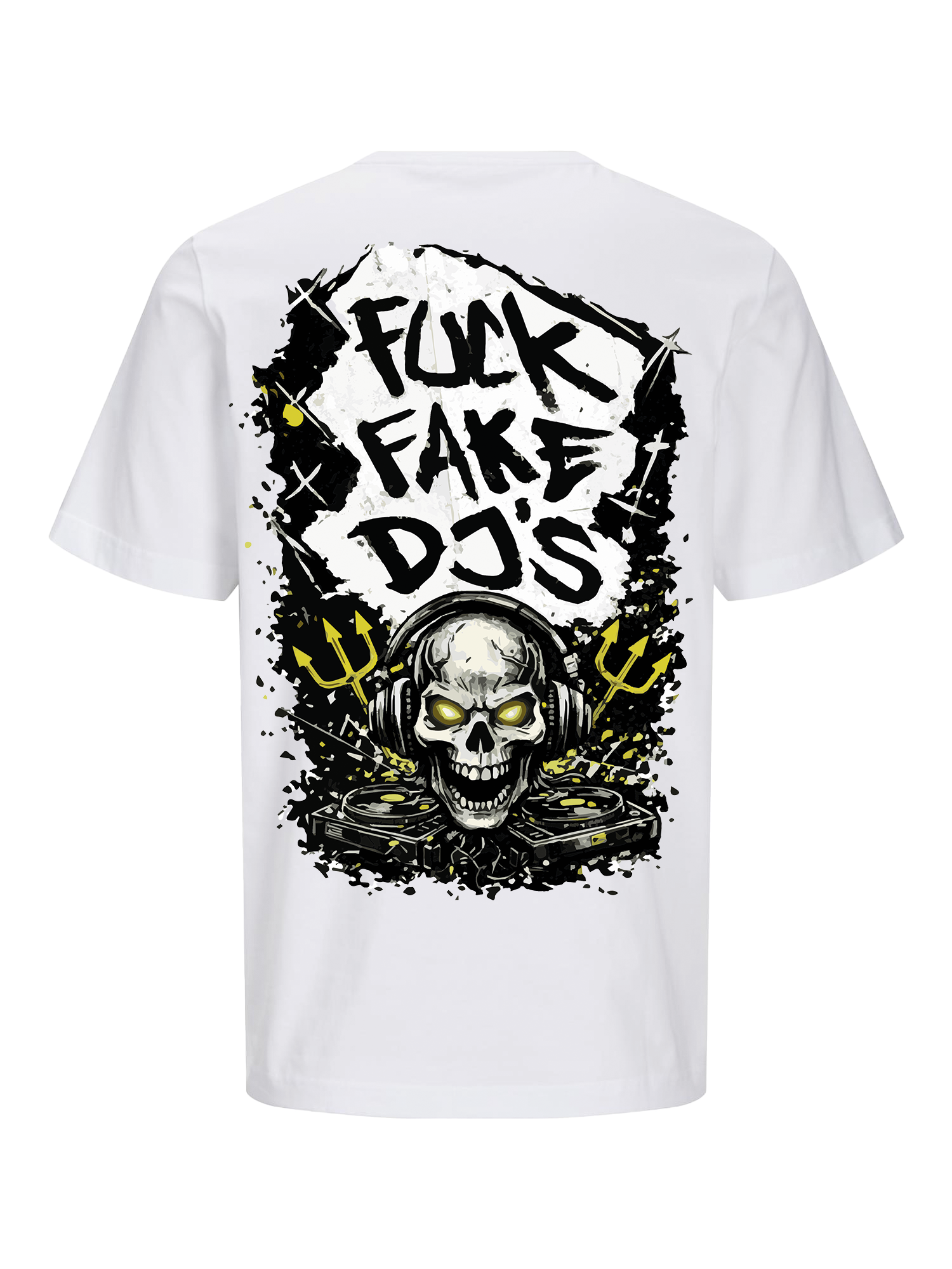 The front features a subtle Sunny D graffiti logo on the chest,The back of the shirt features a striking graphic of a skull with DJ headphones and turntables, combined with the striking text "Fuck Fake DJs." The combination of graffiti style, neon yellow accents, and a raw design gives this shirt a true festival and streetwear vibe.