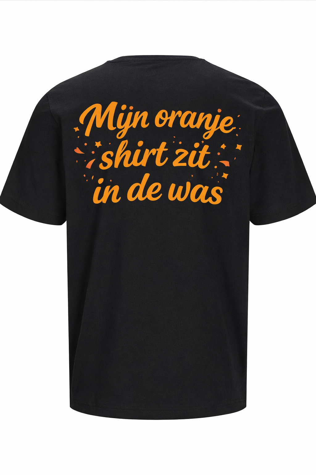 Unisex zwart shirt met als rug opdruk Mijn oranje shirt zit in de was